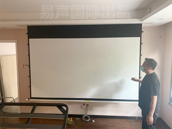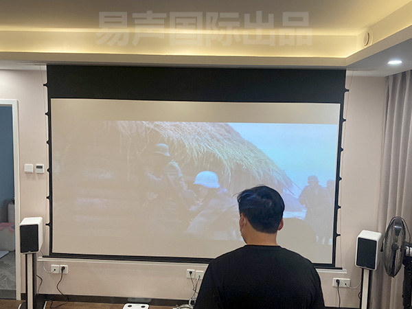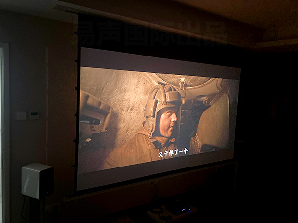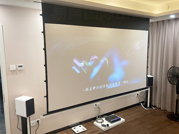 家庭影院使用的银幕被业主要求隐形,我们的工程师特意选择了低噪声电动吸顶安装系列银幕,即使安装环境苛刻,我们的施工队伍也同样完成任务,使得欣赏完电影以后,银幕可以升入天花板预留位置内,房间恢复HI-FI房一般的整齐感觉。与全套匹配的某品牌高清播放器,调校方便,操作简易,可以播放高清电影与发烧源码音乐,一举两得。