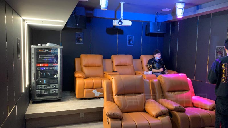 杭州康良祥云府项目为兼顾私家影院和卡拉ok项目,疫情期间业主考虑尽量不去公共娱乐场所,选择在家中享受。业主属于对卡拉ok部分声音部分要求很严格,整体布局又不要太像营业场所的KTV装饰。全套器材对于声音效果的重播,将影响到业主的享用观感,所以整个设备搭建过程丝毫不得马虎。