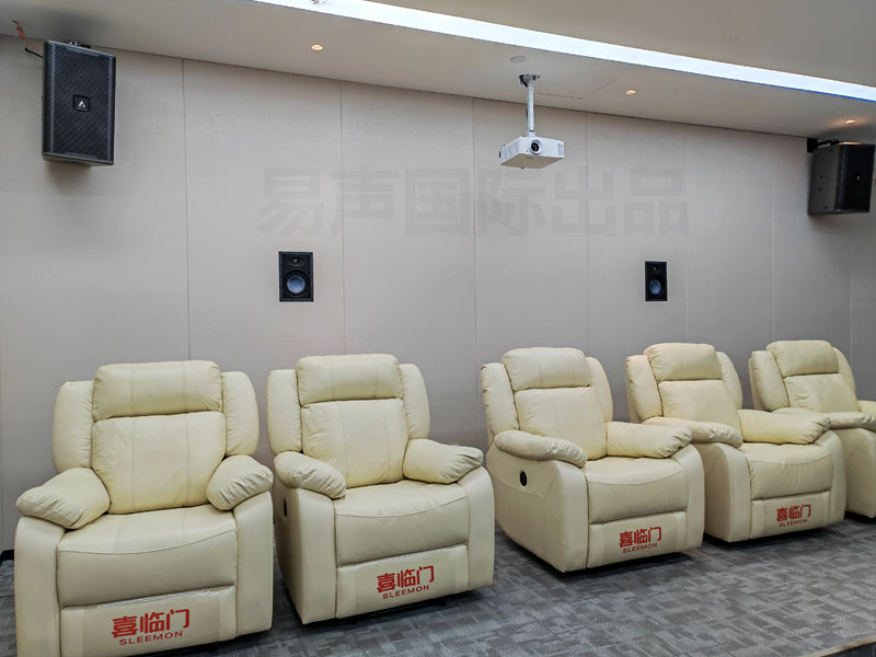 全套家庭影院器材按照杜比全景声9.2.4声道解码环绕音效设计,满足新时代蓝光影碟还原要求,是一步到位的私家影院配置.由于视听室后期设计为双排沙发,侧环绕音箱设计为两组,位置分别对应每排沙发,可以保证每排观众都可以得到同样的声场包围感;值得一提因为房间较宽所以设计为双中置音箱设计,距离拉开一定距离,以保证比较宽的沙发上的各个位置的观众都可以有良好的听感,前声场采用2只12寸口径低音炮的搭配,可以确保在较大环境下享受到震撼影院效果.